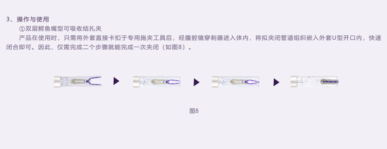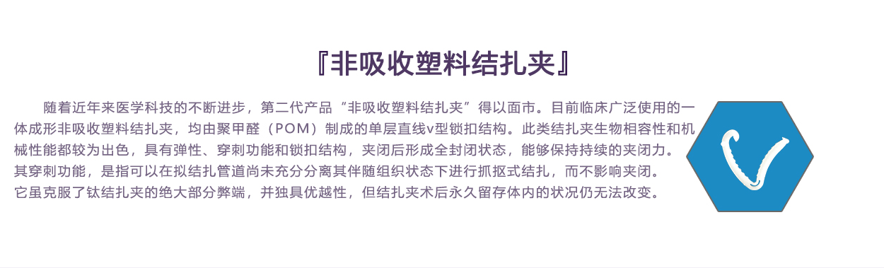 內(nèi)層夾用醫(yī)用染色劑,與進口單層V型可吸收夾顏色一致,提高其可視性。