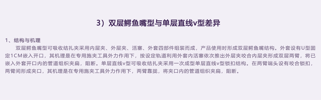 內(nèi)外層夾為雙色設計,涇渭分明。實際使用中內(nèi)外層夾配合夾閉管腔效果一目了然,避免錯誤判斷。